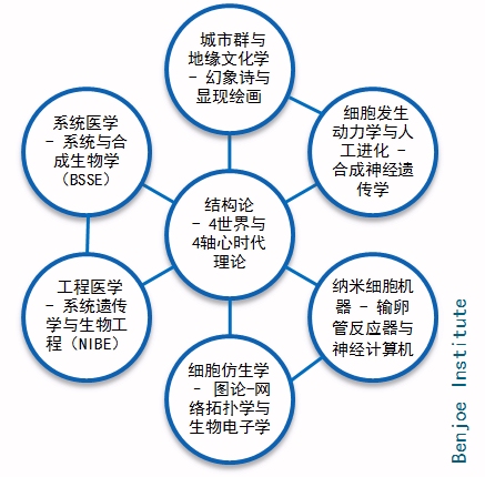 1-泛进化理论 - 从实证分析到系统综合(synthetic)的方法论,1991-1992年城市群与地缘文化学,人工智能与基因工程整合的太阳能-生物电子学(SBE)设计;2-1992-1997年范畴(category)论与图论-网络拓扑学分析,系统医学与药物学 - 系统遗传学与生物工程和人工进化与装配(assemble)论,转基因输卵管反应器和细胞仿生工程 - 基因片段组装合成与细胞系连续突变筛选的方法;3-2008-2010年细胞发生动力学与序列标志片段显示技术,提出神经元计算机与有机(organic)机器人和细胞纳米机器的设计原则。